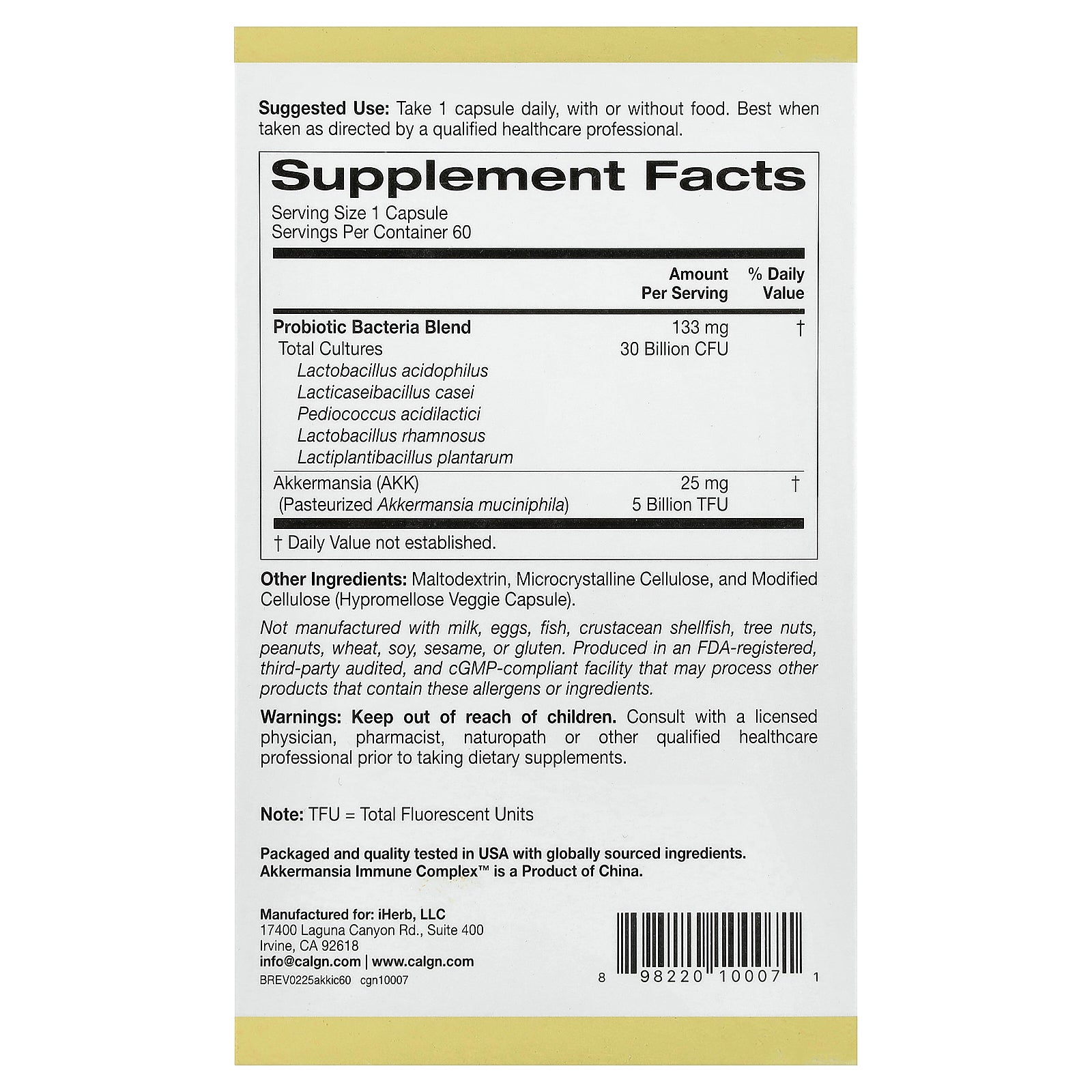 California Gold Nutrition® Akkermansia Immune Complex™ is formulated with 5 live and active strains plus 1 pasteurized strain: Akkermansia muciniphila (AKK). Each veggie capsule contains 30 billion CFU total cultures and 5 billion TFU AKK to deliver an effective number of good bacteria to the body.These bacterial strains have been shown to aid in gut health and digestive wellness, support immune health and contribute to overall health and well-being.* It contains select bacterial strains that are resistant to low pH and gastrointestinal conditions (e.g. acid, bile, pepsin, and pancreatin), as well as adheres to intestinal cell lines.