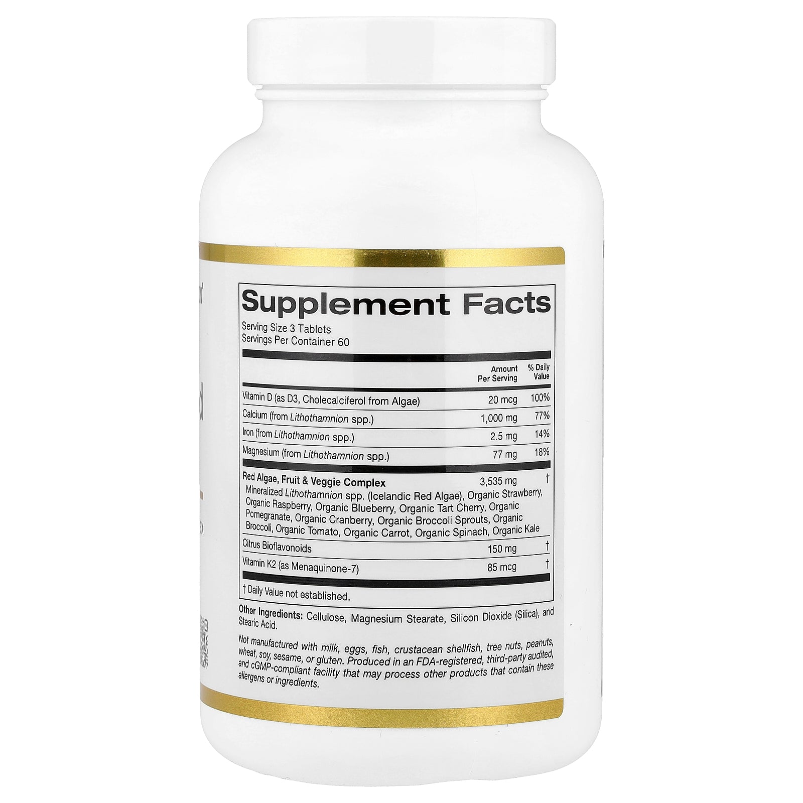 California Gold Nutrition® Algae-Based Calcium contains 1,000 mg of Calcium derived from Icelandic Red Algae. Each serving includes Vitamins D & K2, Magnesium, an Organic Fruit & Veggie Complex, plus Citrus Bioflavonoids.