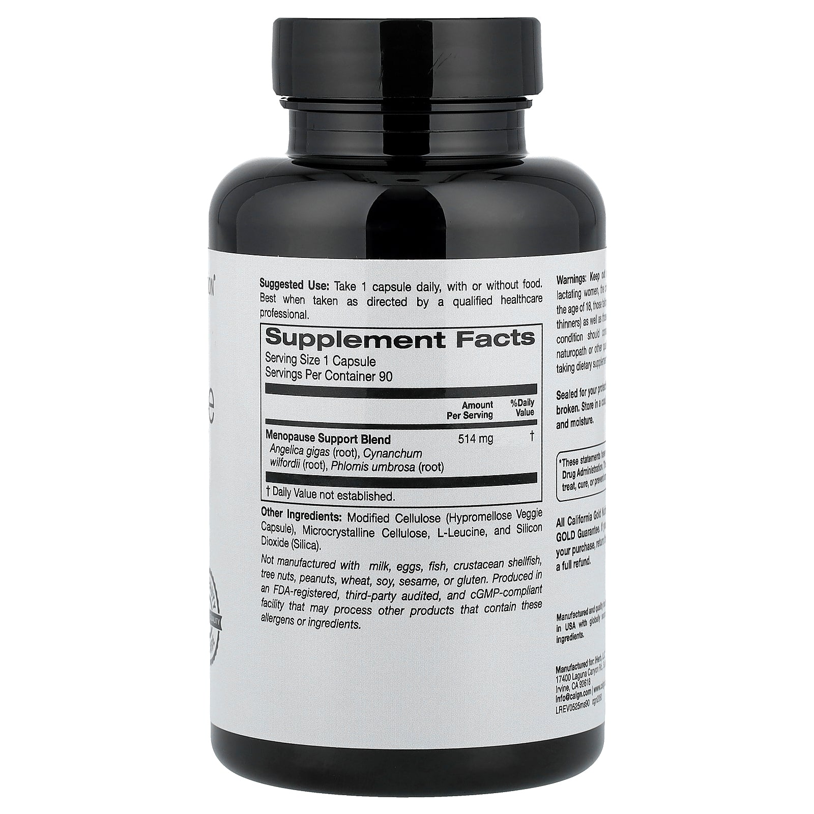 Not manufactured with milk, eggs, fish, crustacean shellfish, tree nuts, peanuts, wheat, soy, sesame, or gluten. Produced in an FDA-registered, third-party audited, and cGMP-compliant facility that may process other products that contain these allergens or ingredients.