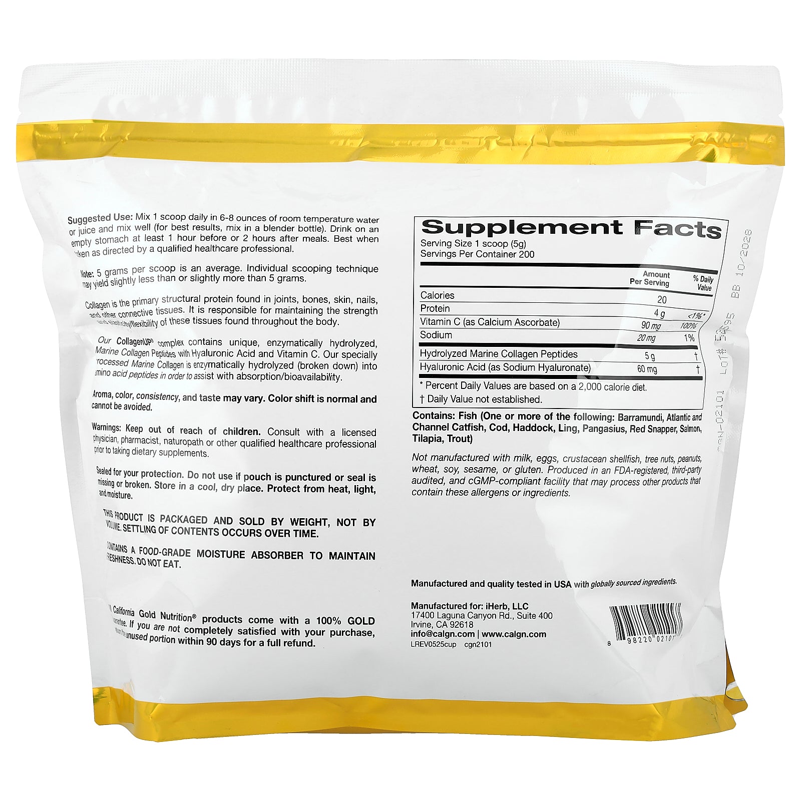 California Gold Nutrition® CollagenUP® features non-bovine, marine-sourced collagen peptides with hyaluronic acid and vitamin C. The specially processed fish collagen is enzymatically hydrolyzed (broken down) into low molecular weight component amino acid peptides in order to help ensure optimal absorption and bioavailability.*