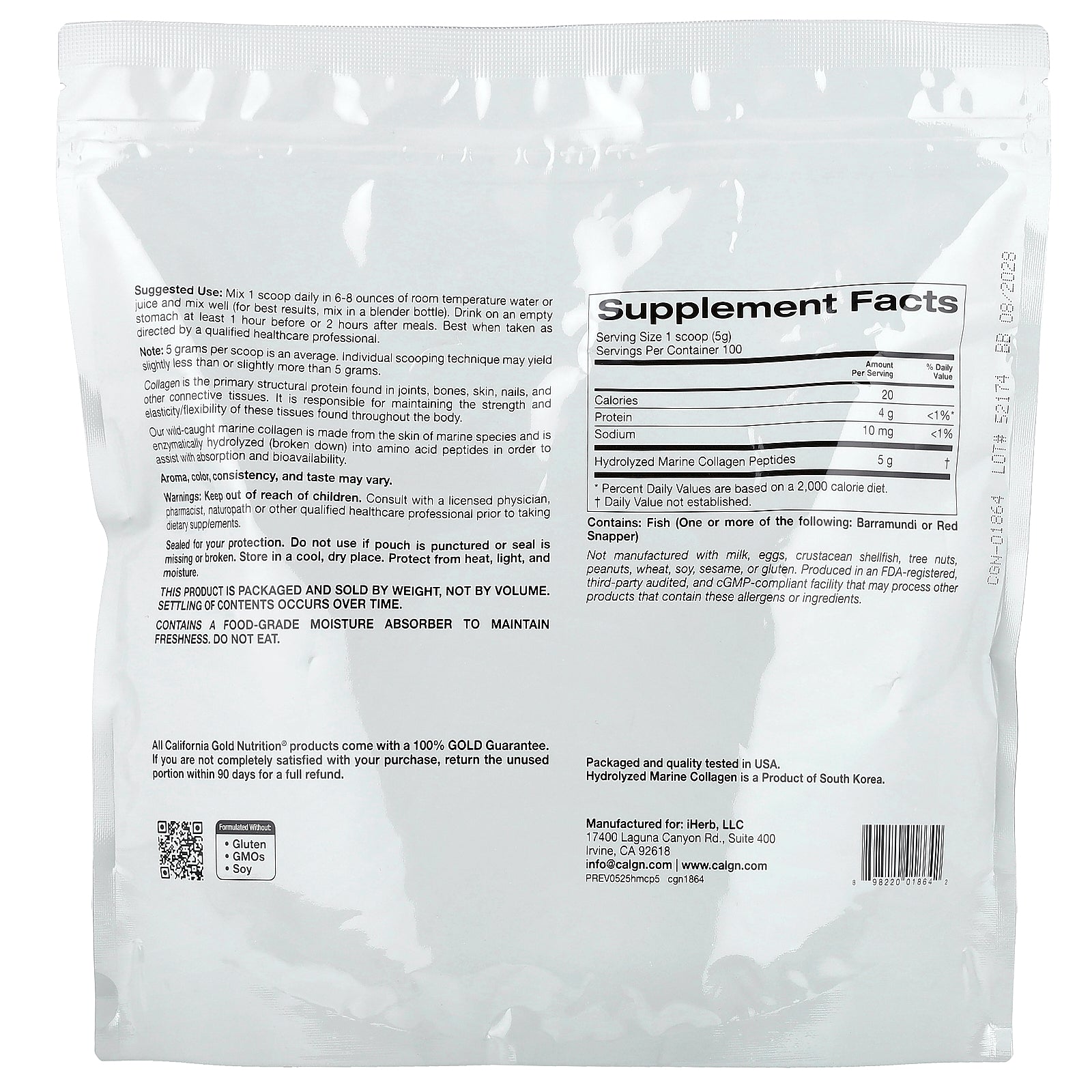 California Gold Nutrition Hydrolyzed Marine Collagen Peptides contains wild-caught marine collagen made from the skin of deep sea, cold water species. It is enzymatically hydrolyzed (broken down) into amino acid peptides in order to assist with absorption and bioavailability.