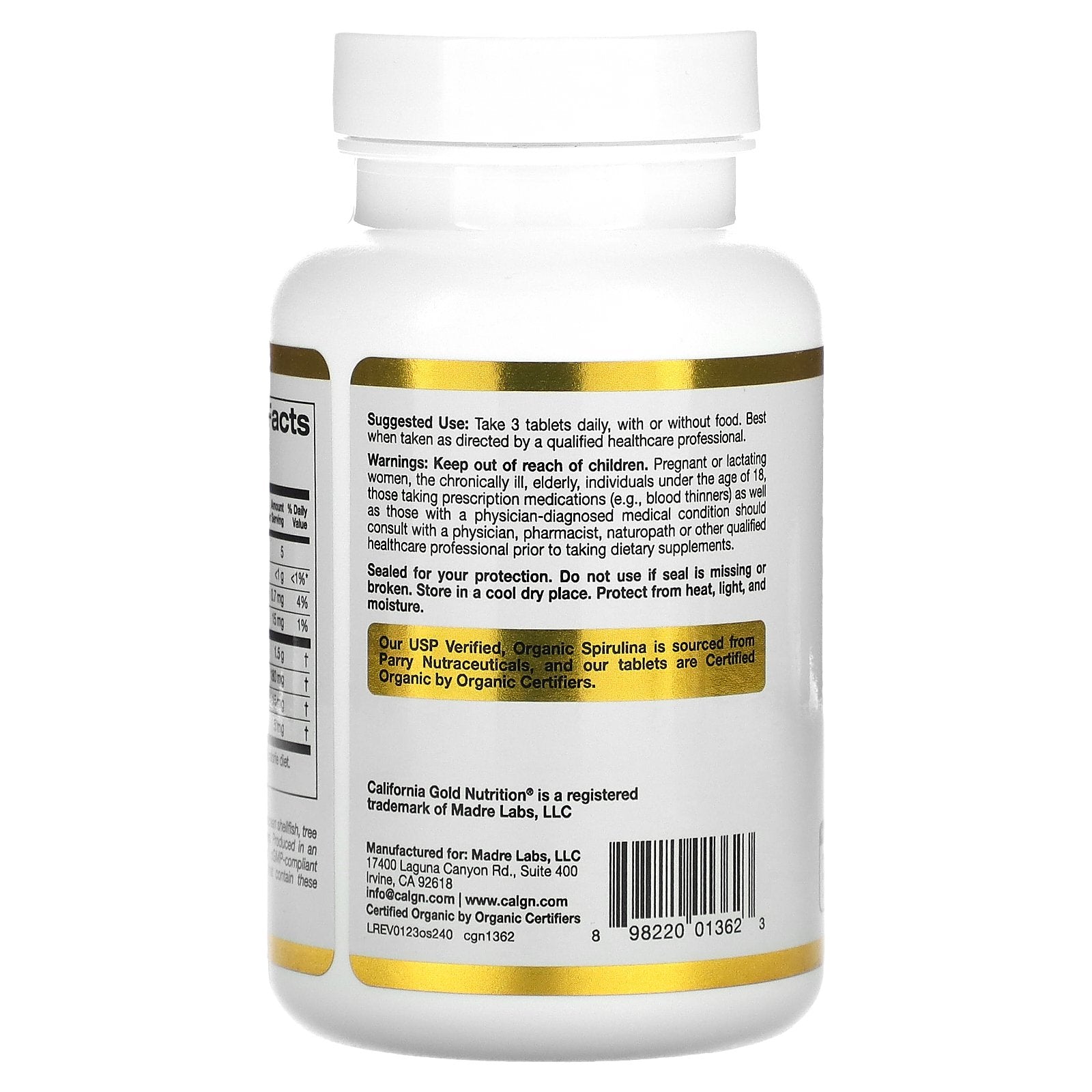 California Gold Nutrition Organic Spirulina contains organic Arthrospira platensis in tablets. The USP verified spirulina in this supplement is sourced from Parry Nutraceuticals, a leader in the blue-green algae industry. It meets or exceeds all qualitative and quantitative quality control specifications. When taken as directed, this provides 80 daily servings.