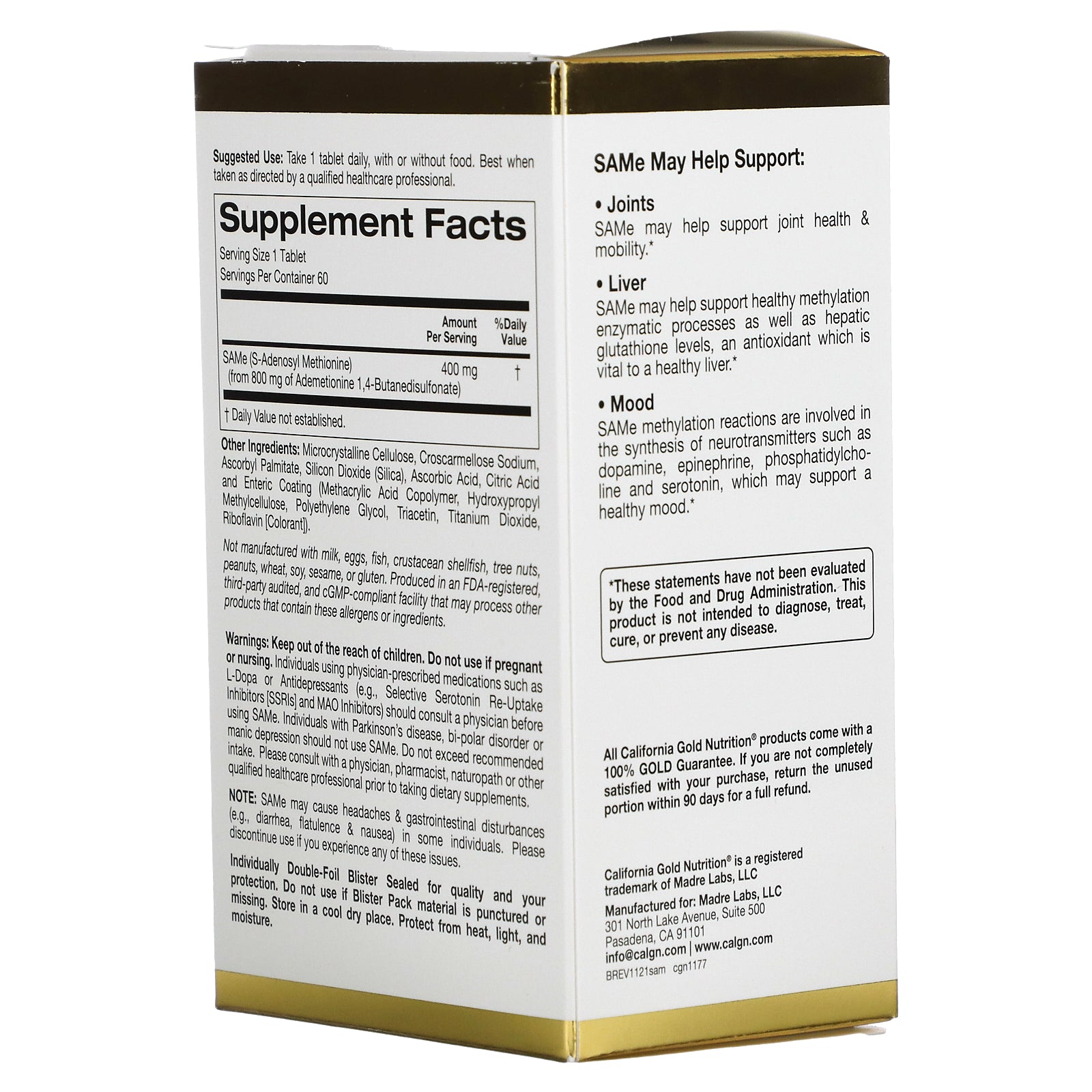 California Gold Nutrition SAMe contains S-Adenosyl Methionine that is produced in a temperature-controlled (low temperature-low humidity) environment, using a proprietary fermentation process to ensure high (S,S) Isomer levels. The tablets are enteric coated and are double-foil blister sealed ensuring product integrity and protection from light, moisture and oxygen.