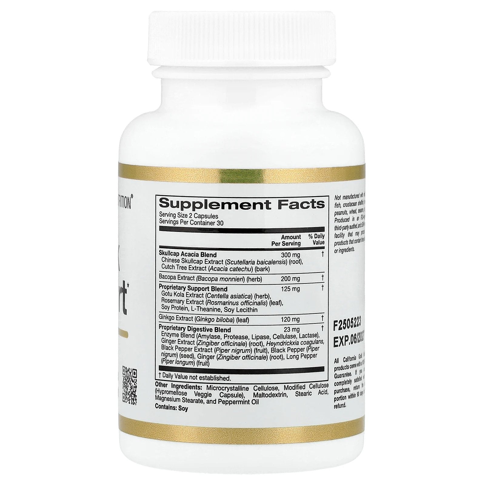 California Gold Nutrition® Think Support* is formulated with a clinically studied bacopa extract to support memory.* This formula features Bacopa and Ginkgo Biloba extracts, combined with a blend of Skullcap and Acacia. The Proprietary Digestive Blend supports digestion.* With the addition of Gotu Kola Extract, Rosemary Extract, Soy Lecithin, Soy Protein, and L-Theanine, this product is formulated to help promote overall memory and cognitive health.*