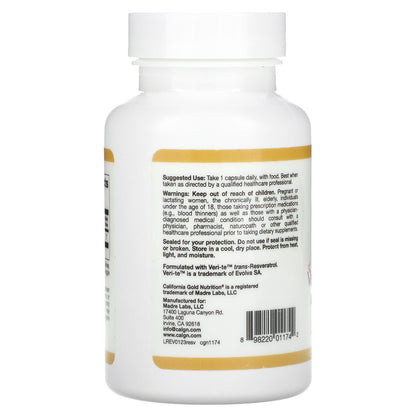 California Gold Nutrition® trans-Resveratrol contains Italian-sourced trans-Resveratrol, which can help support healthy cardiovascular function and antioxidant activity.* Italian-sourced Veri-te™ is free of common contaminants, like emodin and polycyclic aromatic hydrocarbons (PAHs), that are often found in unpurified resveratrol extracts.