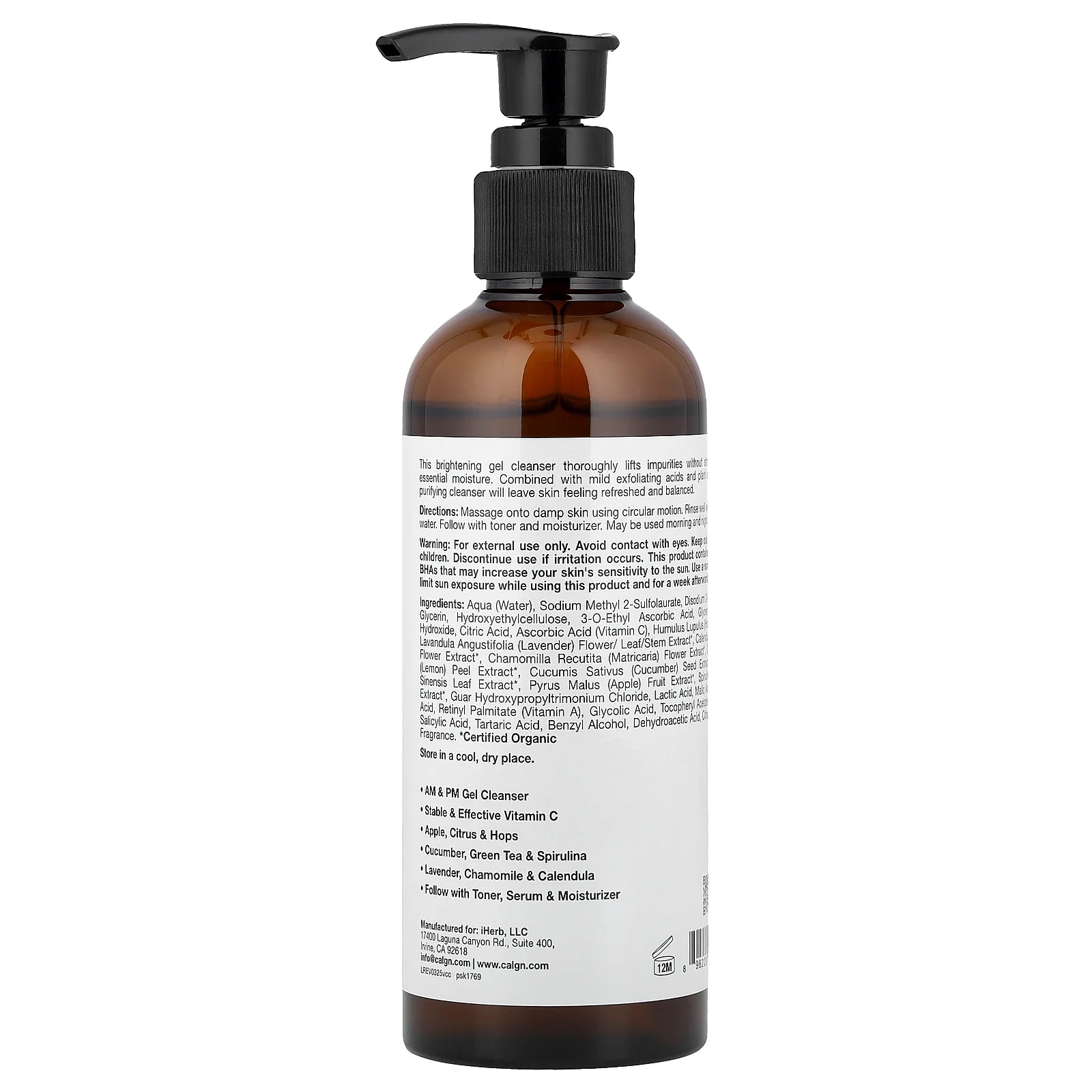 Aqua (Water), Sodium Methyl 2-Sulfolaurate, Disodium 2-Sulfolaurate, Glycerin, Hydroxyethylcellulose, 3-O-Ethyl Ascorbic Acid, Glycerin*, Sodium Hydroxide, Citric Acid, Ascorbic Acid (Vitamin C), Humulus Lupulus (Hops) Extract*, Lavandula Angustifolia (Lavender) Flower/Leaf/Stem Extract*, Calendula Officinalis Flower Extract*, Chamomilla Recutita (Matricaria) Flower Extract*, Citrus Limon (Lemon) Peel Extract*, Cucumis Sativus (Cucumber) Seed Extract*, Camellia Sinensis Leaf Extract*, Pyrus Malus (Apple) Fruit Extract*, Spirulina Platensis Extract*, Guar Hydroxypropyltrimonium Chloride, Lactic Acid, Malic Acid, Gluconic Acid, Retinyl Palmitate (Vitamin A), Glycolic Acid, Tocopheryl Acetate (Vitamin E), Salicylic Acid, Tartaric Acid, Benzyl Alcohol, Dehydroacetic Acid, Citral, Limonene, Fragrance.