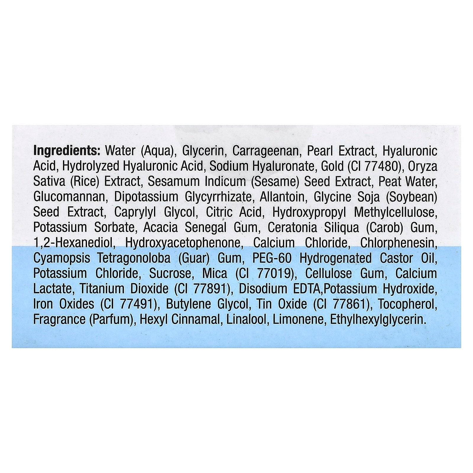 Water (Aqua), Glycerin, Carrageenan, Pearl Extract, Hyaluronic Acid, Hydrolyzed Hyaluronic Acid, Sodium Hyaluronate, Gold (CI 77480), Oryza Sativa (Rice) Extract, Sesamum Indicum (Sesame) Seed Extract, Peat Water, Glucomannan, Dipotassium Glycyrrhizate, Allantoin, Glycine Soja (Soybean) Seed Extract, Caprylyl Glycol, Citric Acid, Hydroxypropyl Methylcellulose, Potassium Sorbate, Acacia Senegal Gum, Ceratonia Siliqua (Carob) Gum, 1,2-Hexanediol, Hydroxyacetophenone, Calcium Chloride, Chlorphenesin, Cyamopsis Tetragonoloba (Guar) Gum, PEG-60 Hydrogenated Castor Oil, Potassium Chloride, Sucrose, Mica (CI 77019), Cellulose Gum, Calcium Lactate, Titanium Dioxide (CI 77891), Disodium EDTA,Potassium Hydroxide, Iron Oxides (CI 77491), Butylene Glycol, Tin Oxide (CI 77861), Tocopherol, Fragrance (Parfum), Hexyl Cinnamal, Linalool, Limonene, Ethylhexylglycerin.