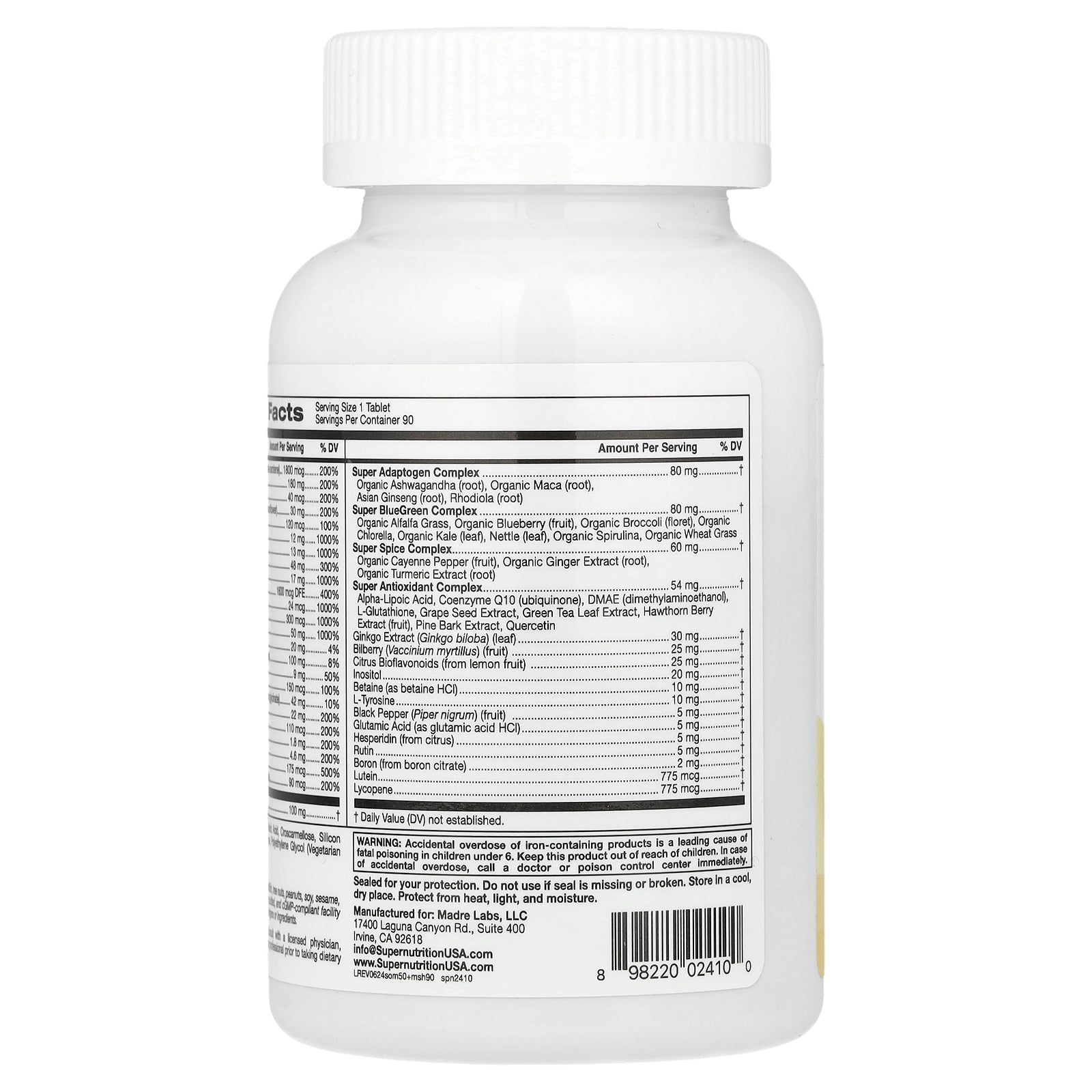 Vitamin A (83% as retinyl palmitate and 17% as beta-carotene), Vitamin C (as ascorbic acid), Vitamin D (as D3, cholecalciferol), Vitamin E (as d-alpha-tocopheryl succinate from sunflower), Vitamin K (as K1, phytonadione), Thiamin (as thiamin HCI), Riboflavin, Niacin (as nicotinic acid and niacinamide), Vitamin B6 (as pyridoxal-5-phosphate), Folate (as 5-MTHF, L-5-Methyltetrahydrofolate), Vitamin B12 (as methylcobalamin), Biotin (as d-biotin), Pantothenic Acid (as d-calcium pantothenate), Choline (as choline bitartrate), Calcium (as calcium carbonate and calcium citrate), Iron (as ferronyl iron), Iodine (from kelp), Magnesium (as magnesium oxide and magnesium glycinate), Zinc (as zinc citrate), Selenium (as sodium selenite), Copper (as copper glycinate), Manganese (as manganese sulfate), Chromium (as chromium picolinate), Molybdenum (as molybdenum amino acid chelate), Super Adaptogen Complex: Organic Ashwagandha (root), Organic Maca (root), Asian Ginseng (root), Rhodiola (root); Super BlueGreen Complex: Organic Alfalfa Grass, Organic Blueberry (fruit), Organic Broccoli (floret), Organic Chlorella, Organic Kale (leaf), Nettle (leaf), Organic Spirulina, Organic Wheat Grass; Super Spice Complex: Organic Cayenne Pepper (fruit), Organic Ginger Extract (root), Organic Turmeric Extract (root); Super Antioxidant Complex: Alpha-Lipoic Acid, Coenzyme Q10 (ubiquinone), DMAE (dimethylaminoethanol), L-Glutathione, Grape Seed Extract, Green Tea Leaf Extract, Hawthorn Berry Extract (fruit), Pine Bark Extract, Quercetin; Ginkgo Extract (Ginkgo biloba) (leaf), Bilberry (Vaccinium myrtillus) (fruit), Citrus Bioflavonoids (from lemon fruit), Inositol, Betaine (as betaine HCl), L-Tyrosine, Black Pepper (Piper nigrum) (fruit), Glutamic Acid (as glutamic acid HCl), Hesperidin (from citrus), Rutin, Boron (from boron citrate), Lutein, Lycopene.