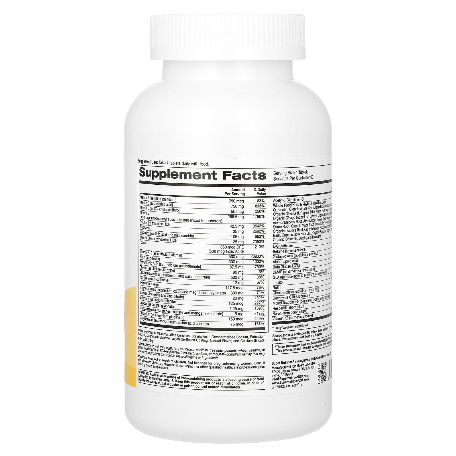Vitamin A (as retinyl palmitate), Vitamin C (as ascorbic acid), Vitamin D (as D3, cholecalciferol), Vitamin E (as d-alpha tocopheryl succinate and mixed tocopherols), Thiamin (as thiamine HCl), Riboflavin, Niacin (as nicotinic acid and niacinamide), Vitamin B6 (as pyridoxine HCl), Folate, Vitamin B12 (as methylcobalamin), Biotin (as d-biotin), Pantothenic Acid (as d-calcium pantothenate), Choline (as choline bitartrate), Calcium (as calcium carbonate and calcium citrate), Iron (as ferrous carbonyl), Iodine (from kelp), Magnesium (as magnesium oxide and magnesium glycinate), Zinc (as zinc oxide and zinc citrate), Selenium (as sodium selenite), Copper (as copper glycinate), Manganese (as manganese sulfate and manganese citrate), Chromium (as chromium picolinate), Molybdenum (as molybdenum amino acid chelate), Acetyl-L-Carnitine HCl, Whole Food Herb & Phyto-Antioxidant Blend (Quercetin, Organic Alfalfa Grass, Rose Hips, Hawthorn Berry Extract, Organic Olive Leaf, Organic Bitter Melon Fruit, Organic Schizandra Berry Fruit, Organic Ginkgo biloba Leaf Extract, Organic Bilberry Fruit, Organic Astragalus membranaceus Root, Atractylodes lancea Root, Organic Rehmannia Root, Suma Root, Organic Maca Root, Organic Fo-Ti Root, Organic Codonopsis Root, Organic Licorice Root, Organic Ginger Root, Organic Nettles Leaf, Pau d’Arco Bark, Organic Gotu Kola Leaf, Organic Spirulina, Organic Dandelion Root, Organic Chlorella, Lutein, and Lycopene), L-Glutathione, Betaine (as betaine HCl), Glutamic Acid (as glutamic acid HCl), Alpha-Lipoic Acid, Beta Glucan 1,3/1,6, DMAE (as dimethylaminoethanol), GLA (gamma-linolenic acid from borage seed oil), Inositol, Rutin, Citrus Bioflavonoids (from lemon fruit), Coenzyme Q10 (Ubiquinone), Mixed Tocopherols (d-gamma, d-delta, d-alpha, d-beta), Hesperidin (from citrus), Boron (from boron citrate), Vitamin K (as K2, menaquinone-7).